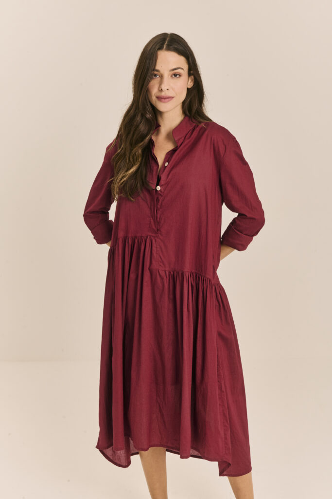 O vinho aparece nesta coleção como um tom profundo e elegante, que adiciona sofisticação mesmo nos dias de calor. Longe de ser uma cor exclusiva do inverno, ele ganha leveza em tecidos naturais e modelagens amplas.